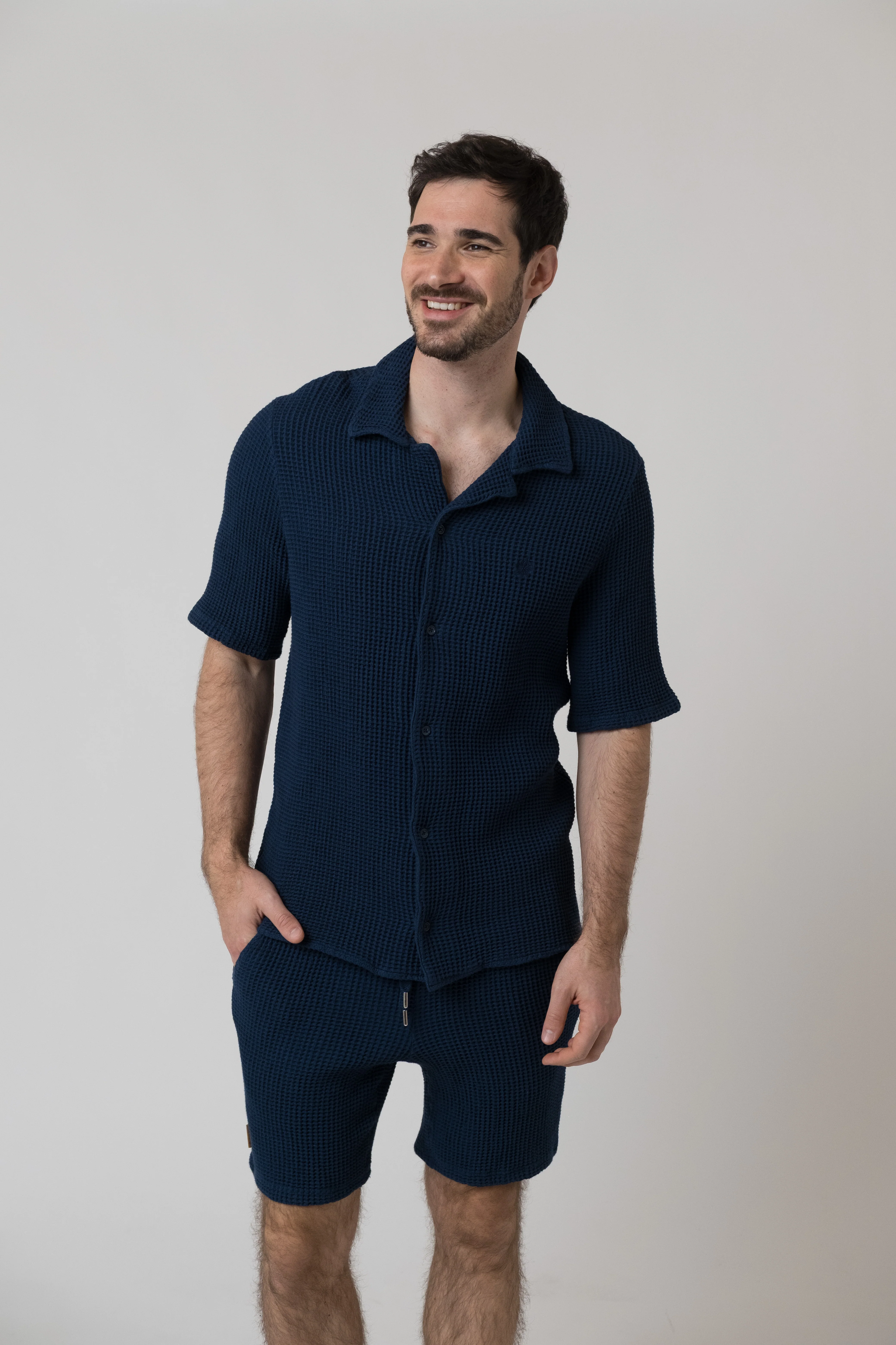 Lässiges Kurzarm-Hemd mit Waffelstruktur und dezenter Edelweiß Stickerei. Trage es offen über ein weißes T‑Shirt mit den passenden Waffle-Shorts oder geknöpft zu einer Chino - perfekt für einen entspannten Sommer-Look.